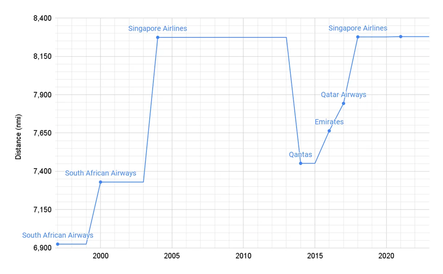 不幸的是,南非航空的统治并没有持续下去。2004年,新加坡航空开通了纽约纽瓦克自由国际机场(EWR)和新加坡(SIN)之间的空客A340航班,航线的总距离为8,274海里(约15,323公里),这个距离此后只被稍微超越,而且是被新加坡航空自己。