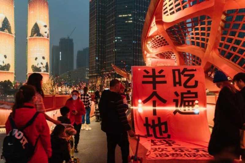 作为国内首座多元场景融合的人行天桥,交子之环上面是闲散漫步的人群,下面是川流不息的车流,集通行、观光、看展、休闲等功能于一体。优越的位置还为游客提供了双子塔的最佳观景位,大气的红色背景怎么拍都是大片,建议在睛天下午的时候去,能赶上迷人的晚霞,夜晚亮灯后别有一番风情。