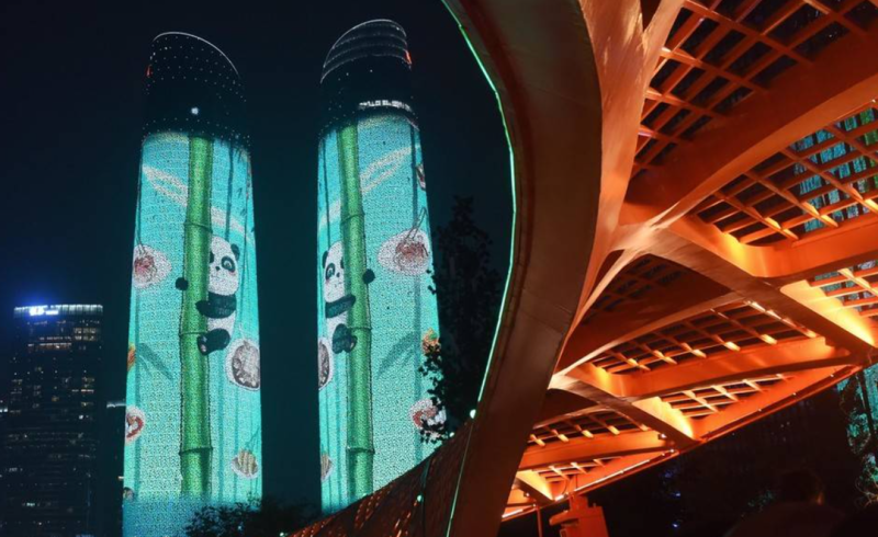 双子塔拥有全LOW-E中空玻璃幕墙,是灯光秀的最佳舞台。众多展秀里,宣传方言的那一场人气很高,通过生动形象的艺术字体动画,游客能学到你在爪子(你在干什么)、耙耳朵(非常听老婆话的男人)、耍朋友(处对象)、切猫儿(青蛙)、鱼摆摆(鱼)等地道成都方言,了解成都文化。