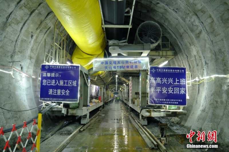 据了解,TBM掘进机现正以日均30米的速度快速掘进,创造大直径TBM在复杂地层掘进新速度。图为天山胜利隧道施工现场,天山号TBM。
