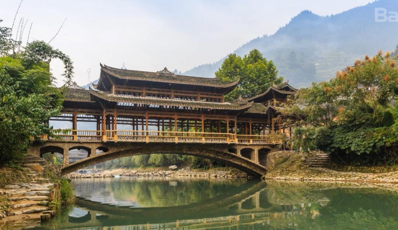 风雨桥又称花桥,是侗族建筑中最具特色的民间建筑之一。 苗寨喜欢依山而立,侗寨则大多修在河溪两旁,跨水而居。这种桥因桥上建有长廊式、可遮蔽风雨的桥屋而得名。