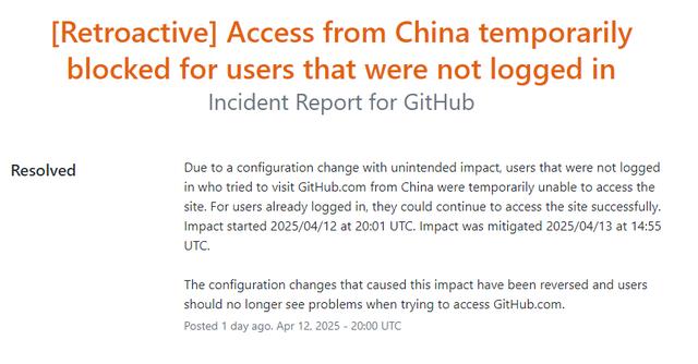GitHub官方在状态页回应道:“由于一项配置更改造成了意外影响,中国境内未登录的用户在尝试访问GitHub.com时出现暂时无法访问的情况,而已登录的用户仍能正常访问。影响于2025年4月12日20:01 UTC(北京时间4月13日凌晨4:01)开始,并于2025年4月13日14:55 UTC(北京时间4月13日22:55)缓解。目前导致此影响的配置更改已被撤销,用户在尝试访问GitHub.com时不会再遇到问题。”