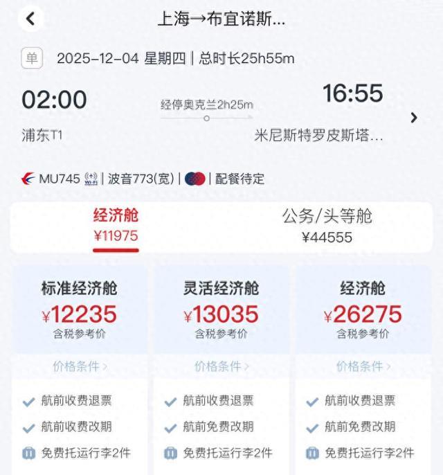 记者在东航APP查询12月4日的该趟航班,单程价格经济舱在1.2万元左右起,公务舱在4.5万元左右起。
