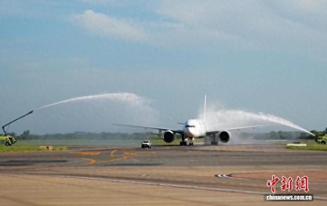 中新网上海12月5日电 (记者 殷立勤)当地时间12月4日16时44分,东航MU745航班平稳降落在阿根廷首都布宜诺斯艾利斯的埃塞萨国际机场,当地以象征国际民航最高礼仪的“水门仪式”为远道而来的旅客和机组人员接风洗尘。