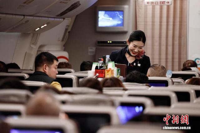 客舱乘务员在航班上为旅客服务。东航供图