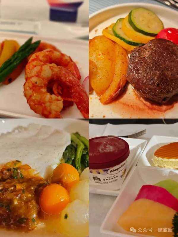 第二顿正餐是在抵达奥克兰之前,在平躺座椅上睡饱的小圈,把首航限定菜单上的美食都吃了个遍。