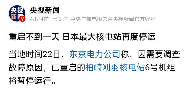 消息来源:央视新闻1月22日报道《重启不到一天 日本最大核电站再度停运》