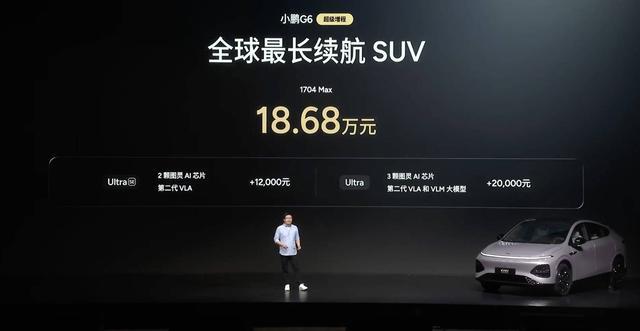 新车定名为小鹏 G6 超级增程版,起售价 18.68 万元。这个入门的 1704 Max 版本,标配了一颗小鹏自研的图灵 AI 芯片。对于有更高算力需求的用户,小鹏还提供了另外两个版本: