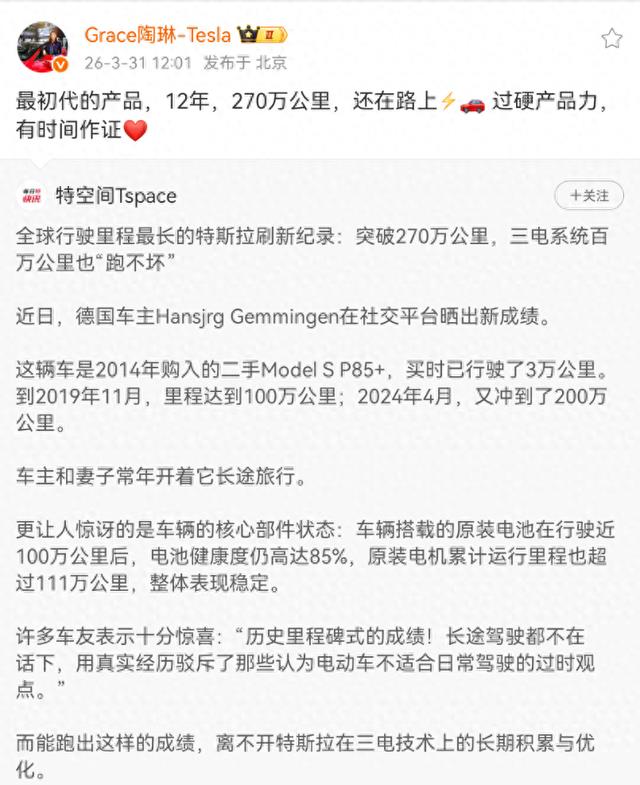 今日,特斯拉副总裁陶琳回应一辆初代Model S P85+行驶超270万公里一事称,过硬产品力有时间作证。
