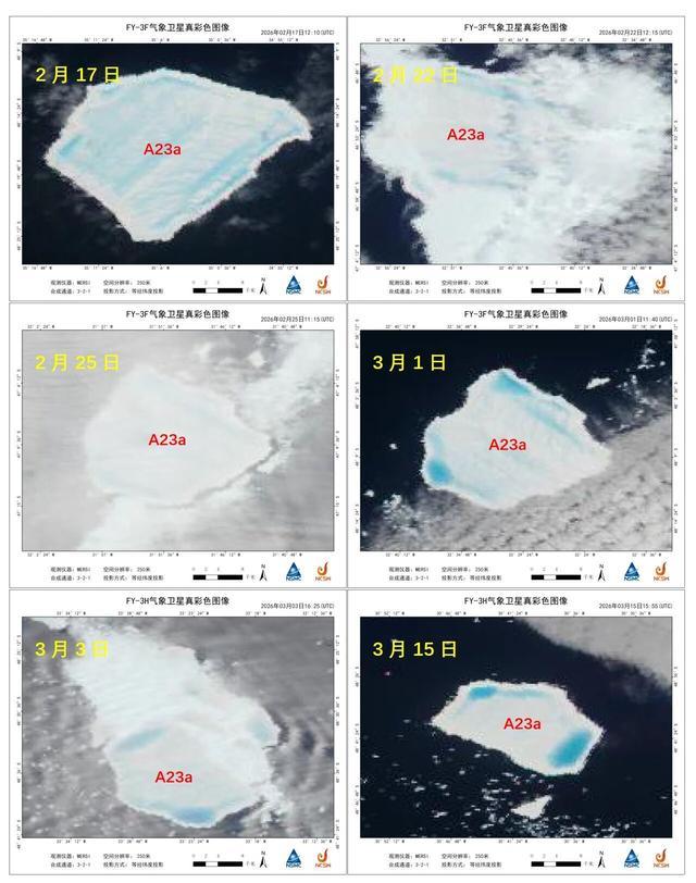 A23a是1986年从南极洲菲尔希纳冰架崩裂形成的巨型冰山,初始面积达4170平方公里,厚度近400米,总重量约1万亿吨。国家卫星气象中心(国家空间天气监测预警中心)国际用户服务中心首席专家郑照军及其团队基于风云气象卫星等遥感资料长期追踪监测A23a的移动轨迹、形态变化与崩解过程。