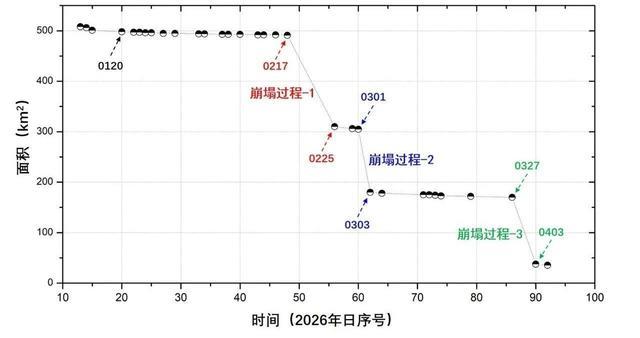 第一次崩塌发生在2026年2月底,A23a转头向西南移动,面积不断减少,2月25日的面积为310平方公里;仅仅稳定了几天,又发生第二次崩塌,面积减少至3月3日的180平方公里;一周后又转向东移动,直至3月底、4月初,在南纬48.5度、西经30.5度附近完成了标志着“冰山销户”的末次崩塌,面积由3月27日的169平方公里骤降至4月3日的35.2平方公里。此时,冰山残余的最大完整碎片长轴为11公里、面积为35.2平方公里,分别跌破了长轴10海里(18.5公里)、面积20平方海里(68.6平方公里)的冰山编号阈值。至此,A23a冰山正式“销号”。