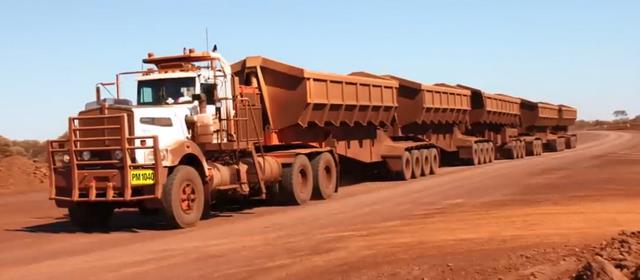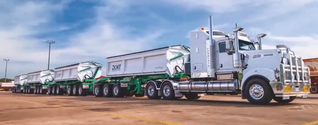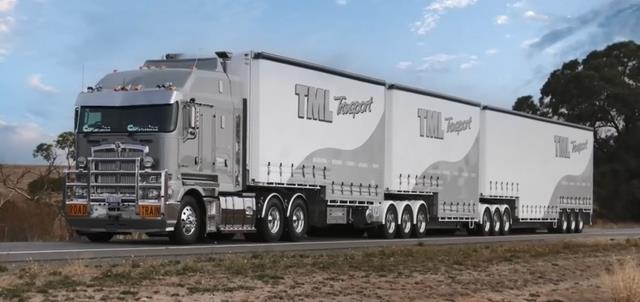 全长 53.5米。由一辆牵引车拖拽 4节全尺寸挂车,是澳大利亚公路上合法运营的超长运输王者。常用于运输牲畜、矿石和大宗物资。超车这种车需要超过1公里的距离,可见其体型有多夸张。