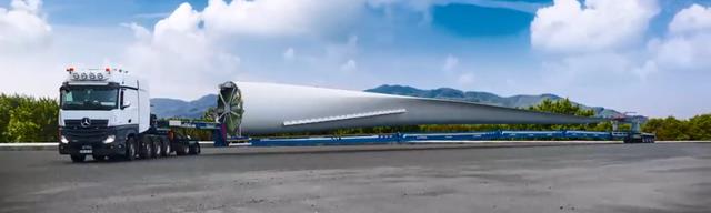 冠军属于风电叶片运输升举车 —— 专门运输风力发电机叶片的超长运输车。标准展开长度可超过 70米,完全伸展后甚至达到 80米以上。真正神奇之处在于尾部升降装置,它能将叶片抬升 60度,使整车尾部“升空”,从而越过房屋、树木,甚至在欧洲狭窄村庄中完成转弯。这是现代工程运输的巅峰之作。