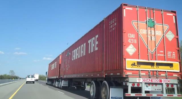 全长 38米。常见于加拿大西部高速公路,由一辆牵引车拖拽两节53英尺标准厢式挂车。与普通双挂短车不同,它是“双全尺寸挂车”配置,因此运力极强。但转弯半径巨大,通常只能在分隔式高速公路上行驶,并受到严格许可管理。
