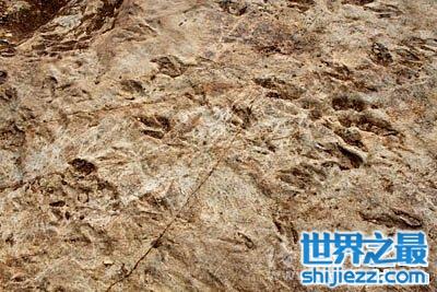 这些足迹是由20多条巨齿龙留下的。巨齿龙是一种与霸王龙相似的食肉恐龙,但是它们生活在距今1亿5千5百万年前的侏罗纪晚期,那个时候霸王龙还没有出现呢。