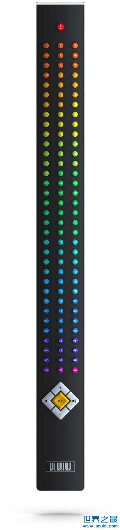 这种遥控器有99个单独的频道按钮,3个额外的按钮让你在原有频道的基础上添加100,200或300个频道。总的来说,使用者最多按两个按钮就可以获得399个频道。当你观看数字较高的频道时,你可以只按三个单独的按钮来节省的时间。有一个事实没有提到,那就是你可以像挥动短棍一样的挥动它来捍卫自己抵御入侵者。但这个该死的东西长20寸。