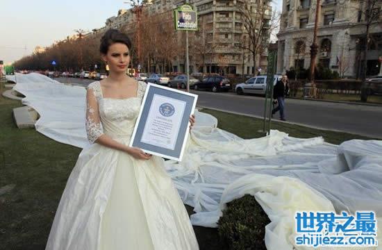 罗马尼亚人推出了这件世界上最长的婚纱,共动用了10个裁缝耗时100天精心缝制而成,使用了4700米塔夫绸、5.5米蕾丝、45米内衬、1857根缝纫针和150轴线。蕾丝来自法国,其他材料均来自意大利,造价5000英镑(约50221元人民币)。不过这一纪录(世界上最长的婚纱)很快又被强大的中国人所打破。