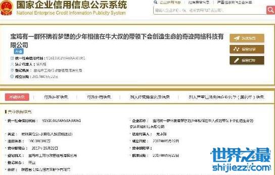 网上曝出一家世界上最长名称公司,名为“宝鸡有一群怀揣着梦想的少年相信在牛大叔的带领下会创造生命的奇迹网络科技有限公司”,这家公司的名字长达30多个字,被网友称为“最长名称公司”、“这公司的名字一口气念不完啊”。小编通过国家企业信用信息公示系统查询后发现,这家公司竟然真!的!存!在!