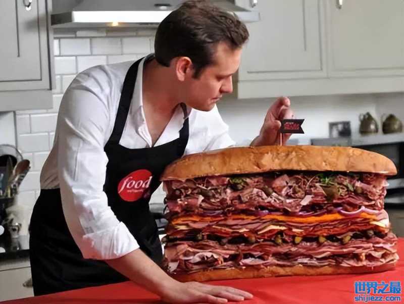 一英国厨师制作出了全世界最复杂的夹肉三明治,该中间有41层不同肉类,高38厘米,宽60厘米,看起来除了种类繁多的肉类还夹杂着许多奶酪、橄榄、腌黄瓜等,这么大的一个三明治看着就香。