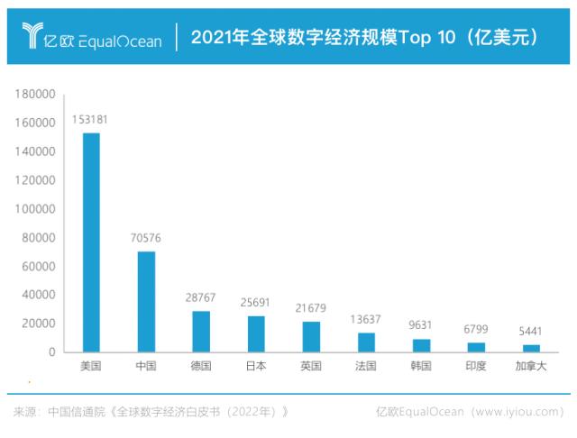 从当前国际格局来看,美、中、欧已成为数字经济三极。根据中国信通院发布的《全球数字经济白皮书(2022年)》,从规模上来看,美国数字经济多年蝉联世界第一,规模达到15.3万亿美元,中国则常年稳居第二,规模为7.1万亿美元,占GDP比重由2012年的21.6%提升至2021年的39.8%。占比上,德国、英国、美国数字经济占GDP比重位列前三位,均超过65%。