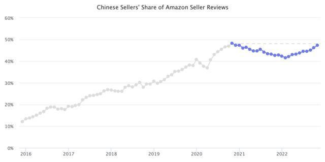 亚马逊中国卖家在美国市场反馈评论总量占比及预测