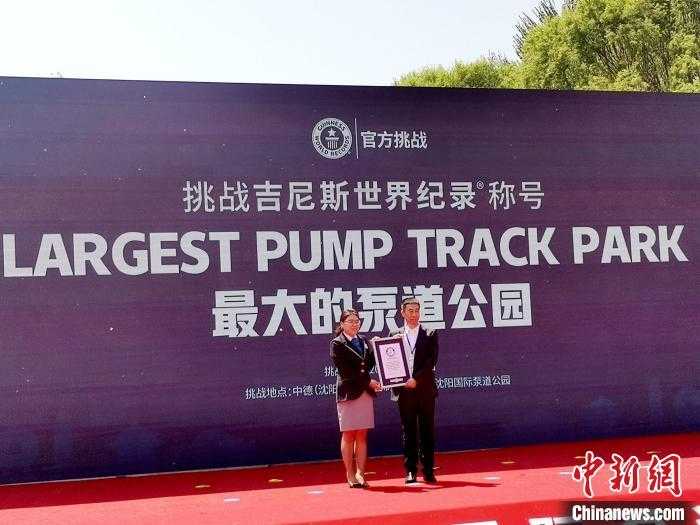 经吉尼斯世界纪录认证机构权威认证,沈阳国际泵道公园为世界最大的泵道公园。在开园仪式现场,吉尼斯世界纪录认证官熊文女士为沈阳国际泵道公园颁发了“Largest pump track park最大的泵道公园”吉尼斯世界纪录认证证书。