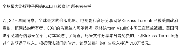 KickassTorrents 、 Torrentz 和 ExtraTorrent ,这几个一度年入千万美刀的主要种子网站都相继关闭;
