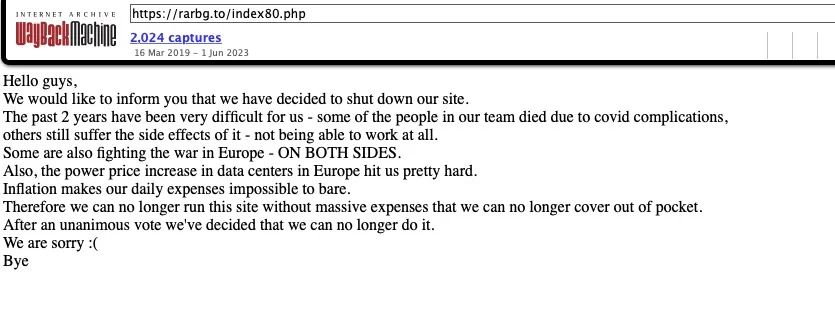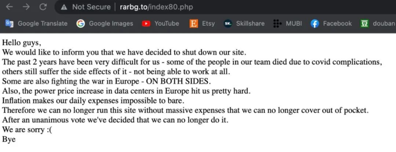 不知道大家有没有听说:全球最大几个 BT 种子网站之一的 RARBG ,要关停了。