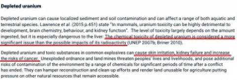 联合国环境规划署曾在一份报告中警告:“贫铀和常见爆炸物中的有毒物质会导致皮肤刺激、肾衰竭,并增加罹患癌症的风险。”