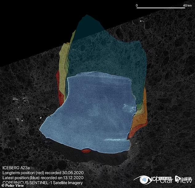 A23a被卡在海底30年,现在正被风和洋流高速带向北方。