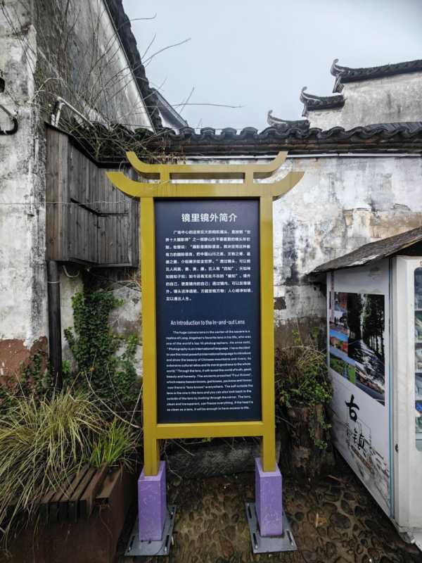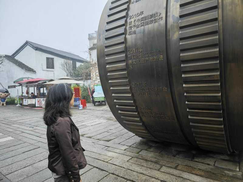 这个打了引号的,硕大的仿制“镜头”在湖州市游埠古镇的入口处。它矗立于街道的正中间,大约有“一层楼”那么高。现场看到,从“镜头”的正面,可以反射出对面的徽派建筑和街道,仿佛在取景构图,这个设计还是颇有点创意的。图一。