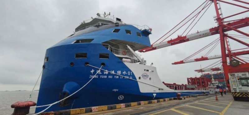 据了解,“中远海运绿水01”轮总长119.8米,型宽23.6米,型深9米,设计吃水5.5米,最高航速19.4公里/小时,8261总吨。在电动集装箱船总长、型宽、装箱数、载重吨及电池容量方面均是世界第一。单船最多可装载36台20英尺标准集装箱大小的电池箱,电池总容量超过五万千瓦时,船舶还可以根据航程的需要,灵活配置电池箱数量,有效解决了传统电动集装箱船充电时间长、装载量低、续航里程短等问题。