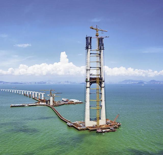 伶仃洋上,深中大桥东西两座主塔矗立于广阔海面上。高270米的全球最高海中桥塔怎么建?智能筑塔机来帮忙。它集合模架爬升、混凝土布料、智能养护等功能,即使遭遇八级大风,也能助力塔柱每天爬升1.2米,施工效率较传统工艺提升1.5倍。