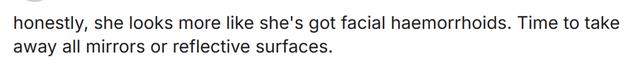 “讲真,她看起来更像是脸上长了痔疮...是时候把所有镜子和反光的东西都给收起来了,不然多吓人。”