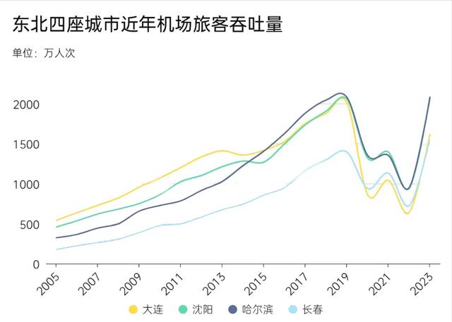 要知道,2010年时,周水子机场作为东北第一个旅客吞吐量千万级的机场,机场旅客吞吐量连续13年高居东北第一,国际旅客吞吐量更居于全国第四,可以说是风光无限,然后不过五年时间就开始不断下跌,哈尔滨、沈阳、长春纷纷超越。