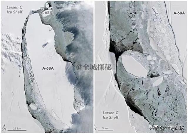 2016年11月10日,美国Nasa在南极大陆的拉森冰架拍摄到一条长达100公里、宽度超过100米、深度达到500米的巨大裂缝,2017年7月,一座巨大冰山博尼这片区域脱离,A68冰山由此诞生,面积达到6000平方公里,成为彼时世界上最大的冰山;