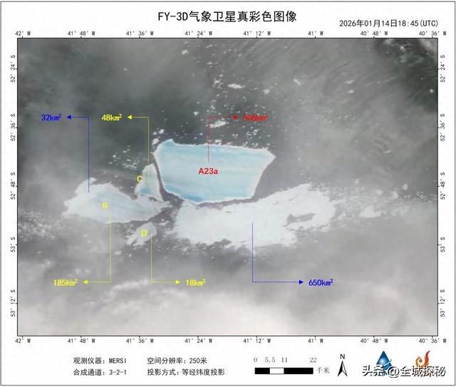 (全城探秘所有原创首发文章,抄袭洗稿必究!)近段时间,A23a冰山引起了很多关注,根据我国风云三号D星1月14日传回的250米级分辨率真彩色图像显示,这座冰山的主体面积目前大约为506平方公里;