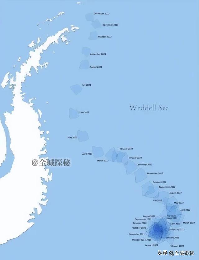 2020年开始移动后,A23a冰山先是随着南极环流绕过南极半岛进入南大西洋,又从高纬度的南极地区一路漂流到南纬50度左右,伴随着纬度降低,气温以及海水温度也逐渐升高,由此A23a冰山也不断分裂和融化,新分离出的冰块,面积较大的甚至超过400平方公里,完全就是一座新的冰山;