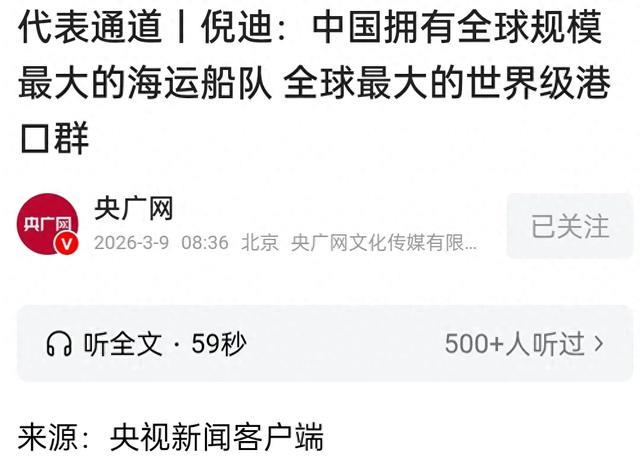 2026年全国两会的“代表通道”与“委员通道”接连传来重磅消息,央广网等媒体报道称:全国人大代表、远洋船长倪迪和全国政协委员、海事教授李颖分别证实,中国已手握全球规模最大的海运船队、全球最大的世界级港口群两大“王牌”,国际海运量占全球近三分之一,上海港更是连续16年稳坐集装箱吞吐量全球头把交椅,从船队规模到港口实力,从航线布局到绿色智能升级,中国已然成为全球海运领域的“领航者”。