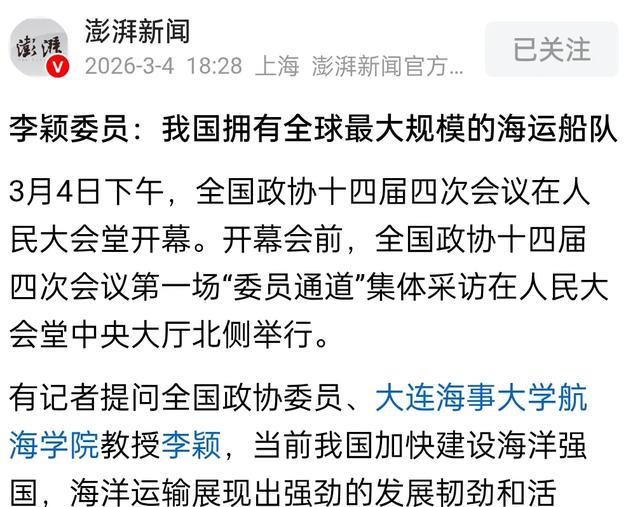 澎湃新闻3月4日报道《李颖委员:我国拥有全球最大规模的海运船队》