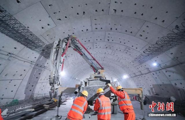 中新社发 肖雨 摄 3月17日,山东济南,世界最大水下盾构隧道——济南黄岗路黄河隧道顺利实现双层贯通。图为3月16日晚,施工人员正在浇筑现浇车道板。据了解,隧道全长约5.75公里,其中盾构段长约3.3公里,采用开挖直径17.5米的“山河号”盾构机施工。