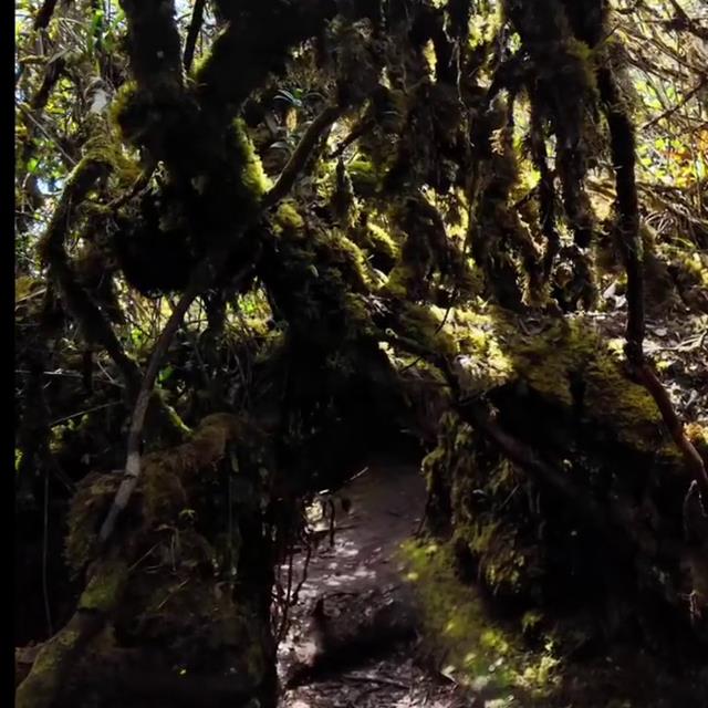 先出发,要先翻过金马伦的这座苔藓森林,这里仿佛一个童话的世界。在路边居然发现了白色的猪笼草,它们长得就像一个个挂在圣诞树上的白色小靴子,周围树上长满了红色的石豆兰,就像一个个圣诞糖果,甚至这里的"苔藓"都进化成了皑皑白雪的模样。