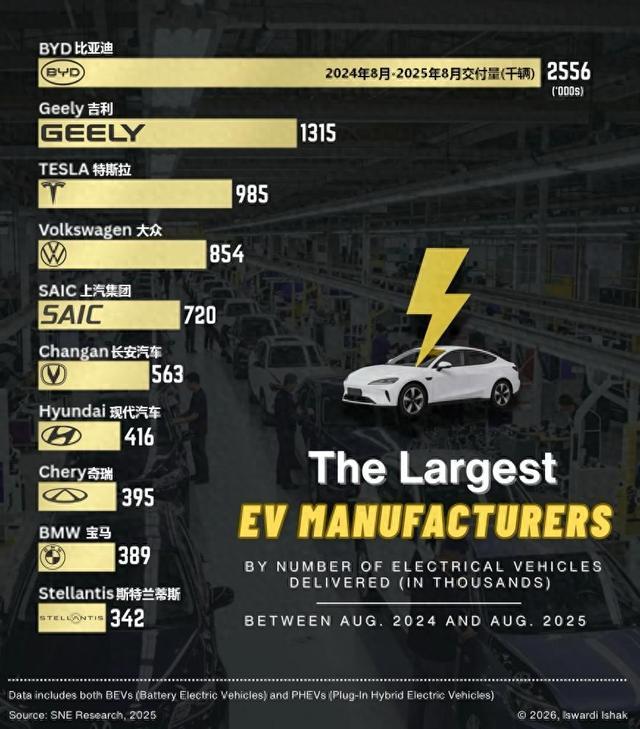 基于SNE Research的数据,下图根据2024年8月至2025年8月期间的交付量对全球最大的十家电动汽车制造商进行排名。