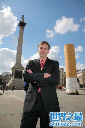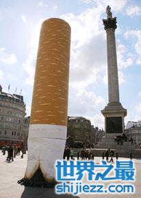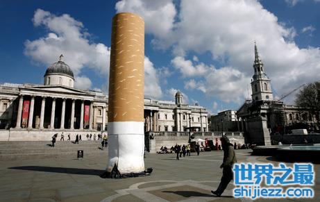 这个世界上最大的烟头矗立在伦敦Trafalgar广场的中间,有9米高。因为伦敦早前颁布了禁止在室内公众场所吸烟的法规,造成了伦敦街道上到处是丢弃的烟头,这个大烟头起着广而告之的作用,就是提醒人们注意环境卫生,不要随意丢弃烟头。最近国内很多城市也颁布了禁烟令,禁止在公共场所吸烟,估计将来也有立这么一个大烟头的必要。