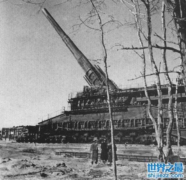 1942年初,终于制成了这门超重型巨炮,它被用克虏伯家族的“古斯塔夫”前缀名命名,希特勒本人和军需部长斯佩尔出席的验收仪式,它被700万马可被军方购买,以工程师的妻子的名字命名匿称“多拉”。它的炮管长达32米,火炮在战斗状态的全长达53米,高12米,全重1488吨。这样的庞然大物在装配、运输和射击试验时遇到极大困难。在试验弹道性能时,装弹机还不太完善,只好用一台起重机把4吨重的炮弹吊送到炮身尾部,再用一辆轻型坦克把它猛地推撞到炮膛里。为了把火炮运送到试验场,特地设计了3辆构造特别的巨型运输列车。沿途的桥梁无法承受这样大的重量,列车只好绕过很长的弯路而行驶。到达阵地后,先用2台巨型起重视吊装底座,然后安装炮架、炮管和装弹机构,全部工作由1名少将指挥1400余人奋战3个星期才完成,高矗的巨炮十分雄伟壮观。为了预防苏军飞机轰炸,阵地四局部署了高炮部队和警戒飞机,大量步兵、巡警和警犬在周围10千米内日夜巡逻。一旦发现敌机轰炸,立即由化学兵施放烟幕掩护。参加指挥、操作、警卫的总人数达到4000人以上,它的炮弹也是骇人听闻,每一枚穿甲弹重7.1顿,一枚高爆弹重4.8顿,推进燃料在1.8吨到2吨。