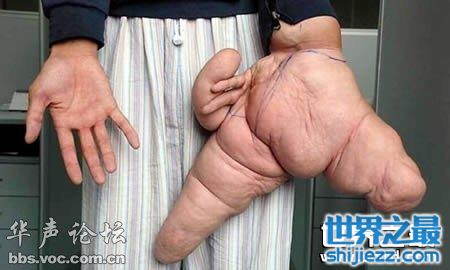 24岁的巨指病人刘华是中国江苏人,在2007年,他被认为是世界上左手最大的人。在他出生的时候,他左手的食指和大拇指就要比其他的手指大很多,随着年龄的增长,这样的巨指严重影响了他的生活。2007年,他在伤害治疗的时候,他左手的大拇指长26厘米,食指长30厘米,中指长15厘米。
