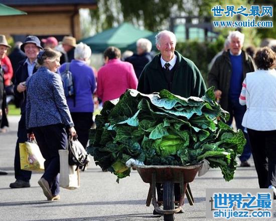 格莱斯布鲁克在园艺展上推着一车巨大卷心菜。各位读者看到这里已经觉得很夸张了,大家先别着急离开,事情还没完,点下一页你将看到更让人不可思议的事情。