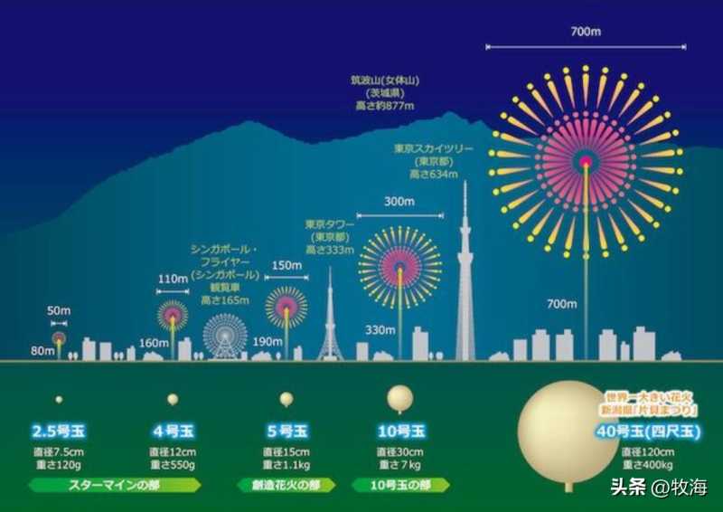 四尺玉在日本的烟花分类等级中被定为40号玉,其规格冲顶日本烟花的排行榜,全面碾压了150m和300m(烟花壳直径)的5号玉和10号玉,但这还不是世界最大的烟花!2017年12月31日,美国格鲁奇烟花公司联合阿联酋共同制作了一个直径约142cm,重997kg的巨型烟花球,大小和重量远超日本的四尺玉烟花。