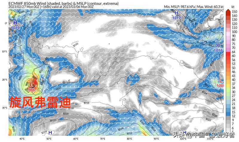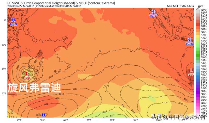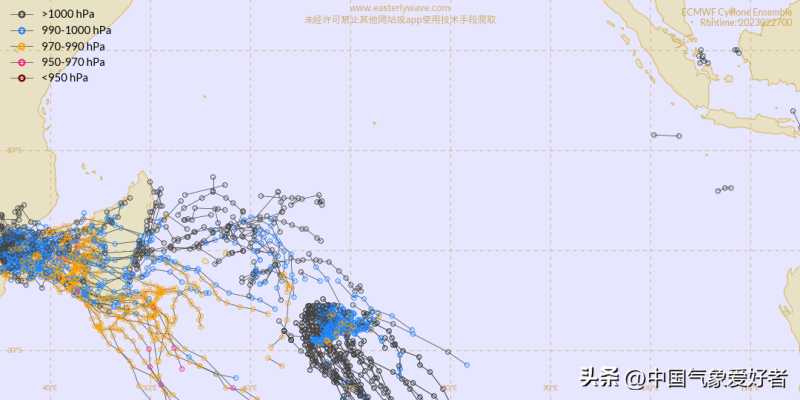 已有超级计算机的预报中指出,在这一地区减弱但并未消散的旋风弗雷迪,接下来有了逐渐复活的态势——像是集合预报中可见,从莫桑比克沿海又有了大量路径线延伸出来,延伸向马达加斯加岛和南印度洋。