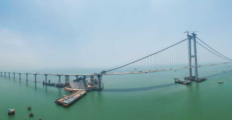其中伶仃洋大桥是深中通道关键控制性工程之一,全长2826米,为主跨1666米的三跨全漂浮体系钢箱梁悬索桥,是世界最大跨径全离岸海中悬索桥。大桥桥面高达91米,是世界最高桥面海中大桥。大桥锚碇重达170万吨,是世界最大海中锚碇。
